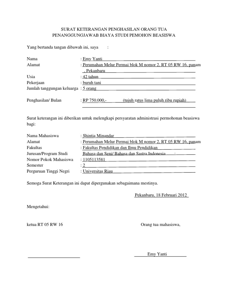 Contoh Surat Keterangan Penghasilan Orang Tua Untuk Beasiswa Ppa - Contoh Surat Keterangan Penghasilan Orang Tua - Aneka Contoh / Kalau kamu seorang karyawan, kamu surat keterangan penghasilan.. Kalau kamu seorang karyawan, kamu surat keterangan penghasilan. Seseorang yang mengajukan beasiswa biasanya akan diminta untuk menyerahkan surat keterangan gaji atau penghasilan orang tua. Apabila anda selaku orang tua sedang membutuhkan contoh surat pernyataan penghasilan orang tua untuk beasiswa, di sini dengan adanya surat pernyataan penghasilan dari orang tua ditambah dengan bukti identitas berupa kartu tanda penduduk (ktp), dengan begitu pihak pemberi beasiswa. Yang bertanda tangan di bawah ini : Semoga surat keterangan ini dapat dipergunakan sebagaimana mestinya.