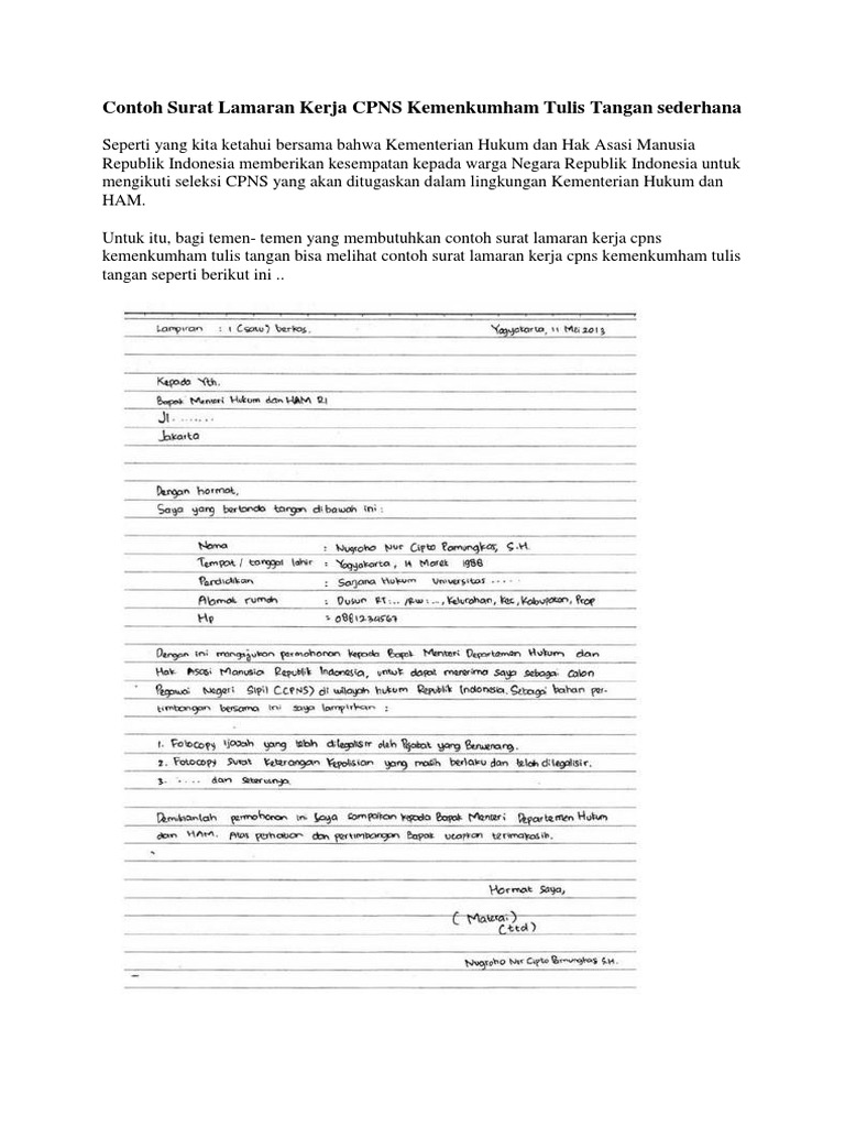 Contoh surat kerja lamaran tulisan tangan cpns.