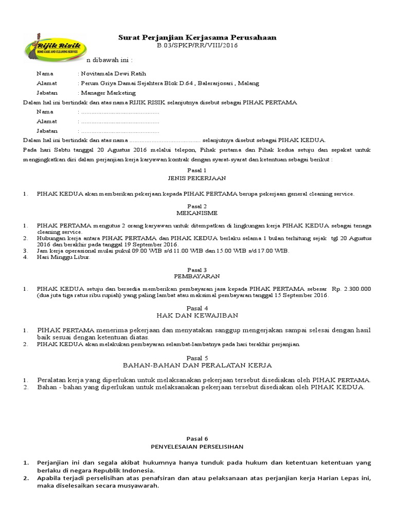 Surat Perjanjian Petugas Kebersihan from imgv2-1-f.scribdassets.com Butuh tanya jawab silahkan lanjutkan pembayaran. Pengertian dan penggunaan perjanjian kerjasama. Pada intinya surat perjanjian kerja dengan surat perjanjian jula beli mirip. Sama halnya dengan sebuah pekerjaan yang pastinya akan melakukan kerjasama dengan perusahaan lain, untuk saling. Biaya jasa kebersihan/cleaning service tersebut di atas berlaku setiap bulannya sampai dengan akhir perjanjian ini. Hal ini bertujuan agar kedua belah pihak tidak ada yang berkhianat di kemudian hari. Adanya saksi dalam surat perjanjian memperkuat dan memperlancar berjalannya kerjasama tersebut. Siapa saja pastinya selalu melakukan kerjasama untuk semakin memperluas link ataupun sebagai bentuk kerjasama dalam hal pekerjaan.